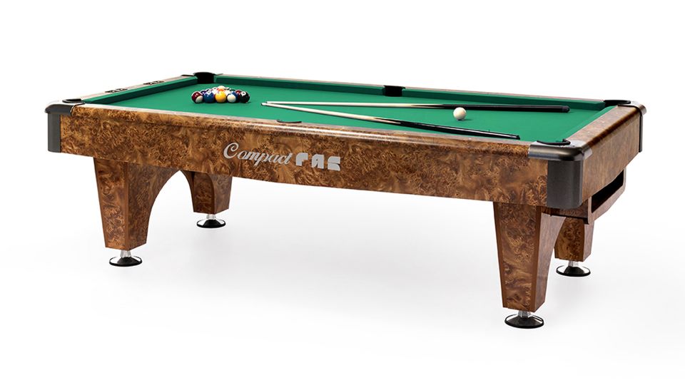 3) Compact 8, un elegante tavolo da biliardo con il campo di gioco in ardesia, sponde professionali e piedini regolabili.