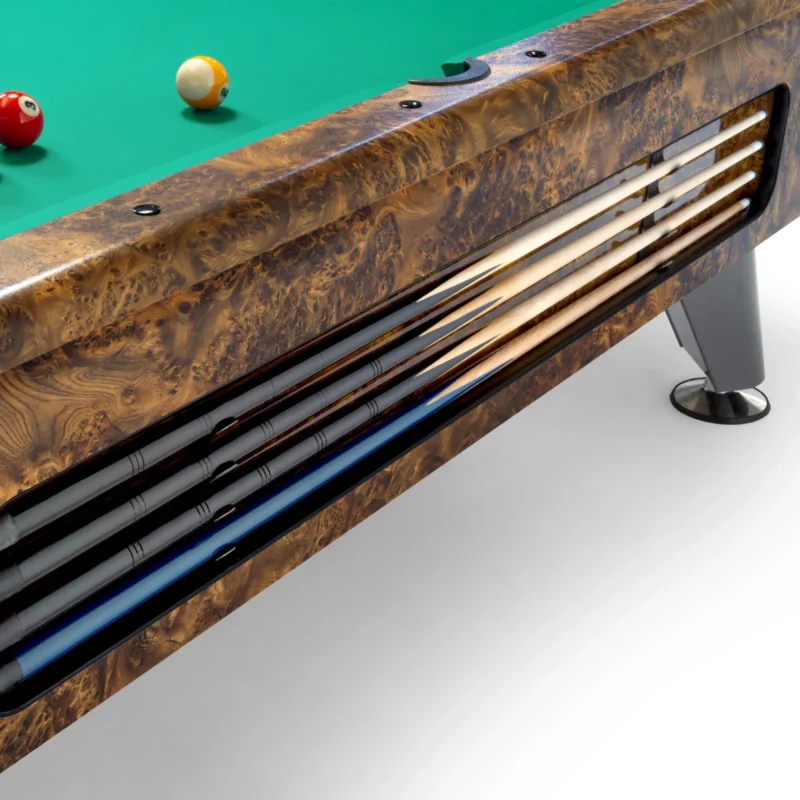 Il campo gioco, disponibile in tre misure (7, 8 e 9 piedi), è composto da un’ardesia professionale in sezione unica, che garantisce la massima stabilità e qualità; questo fa sì che il modello Golden sia il più richiesto per tutti i locali pubblici da divertimento.